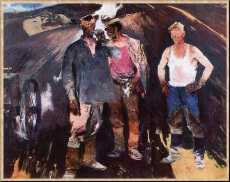 Е. Е. Моисеенко - художник большого дарования и сложной судьбы. Пятнадцатилетним подростком отправляется он из глухого белорусского села в Москву, где в 1931 г. поступает в Художественно-промышленное училище им. М. И. Калинина, на отделение росписи по металлу и папье-маше. Училище давало возможность пройти производственную практику в известных центрах русского народного творчества - селах Жостово, Федоскино, Палех. Не преувеличивая значения этого начального этапа художественного образования, нельзя, однако, не заметить влияния, оказанного народным искусством на дальнейшее творчество художника. Не здесь ли скрыты истоки зрелого живописного стиля Моисеенко - его свободной темпераментной манеры, отказа от правильного академического рисунка, включения в палитру тяжелого черного цвета?
