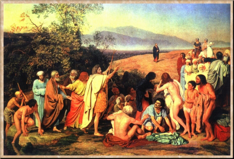 Первая мысль о ее сюжете возникла еще в 1833 г.: он задумал изобразить появление Иисуса Христа в тот момент, когда Иоанн Креститель совершал обряд крещения в реке Иордан. Постепенно художник стал проникаться сознанием значительности этого поворотного события в истории человечества, и замысел его начал приобретать черты грандиозности. В картине он хотел соединить все: духовную идею с чувственным восприятием, религию - с точным знанием, старую живописную традицию - с новыми достижениями, христианскую мифологию - с мифологией античной. В 1835 г. он начал писать картину на довольно большом холсте (172х147 см) и уже был близок к ее завершению, но в 1837 г. взял другой холст, в семь раз больше, и приступил к работе на нем. Прежний вариант он использовал как рабочий эскиз, при этом дотошно переносил в него все то новое, что возникало на большом холсте.